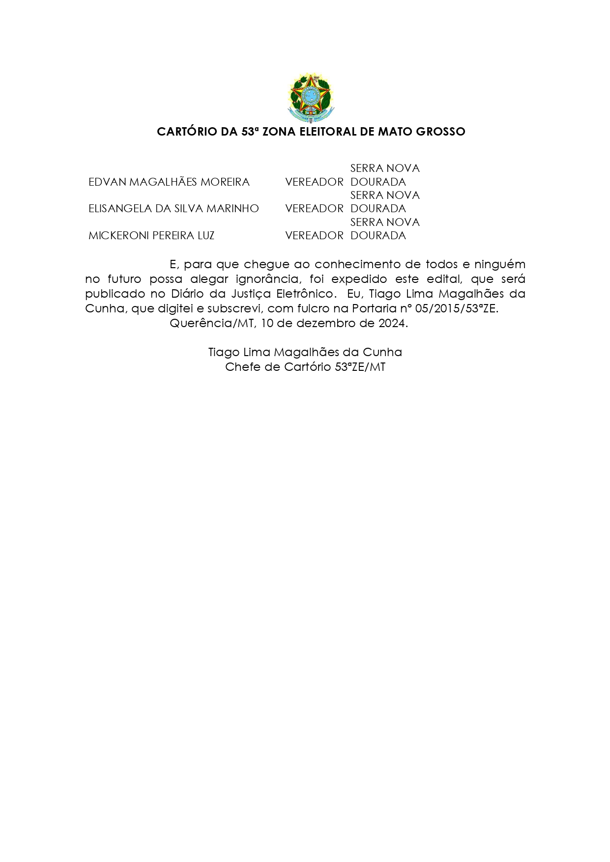 QUERÊNCIA - A cerimônia de diplomação dos candidatos eleitos nas Eleições Municipais de 2024 em Querência será realizada no dia 12 de dezembro, às 10h no horário de Cuiabá (11h no horário local, Brasília), na sede do Cartório Eleitoral da 53ª Zona Eleitoral, em Querência. O evento oficializa os mandatos dos eleitos e também contempla os municípios de Bom Jesus do Araguaia e Serra Nova Dourada.