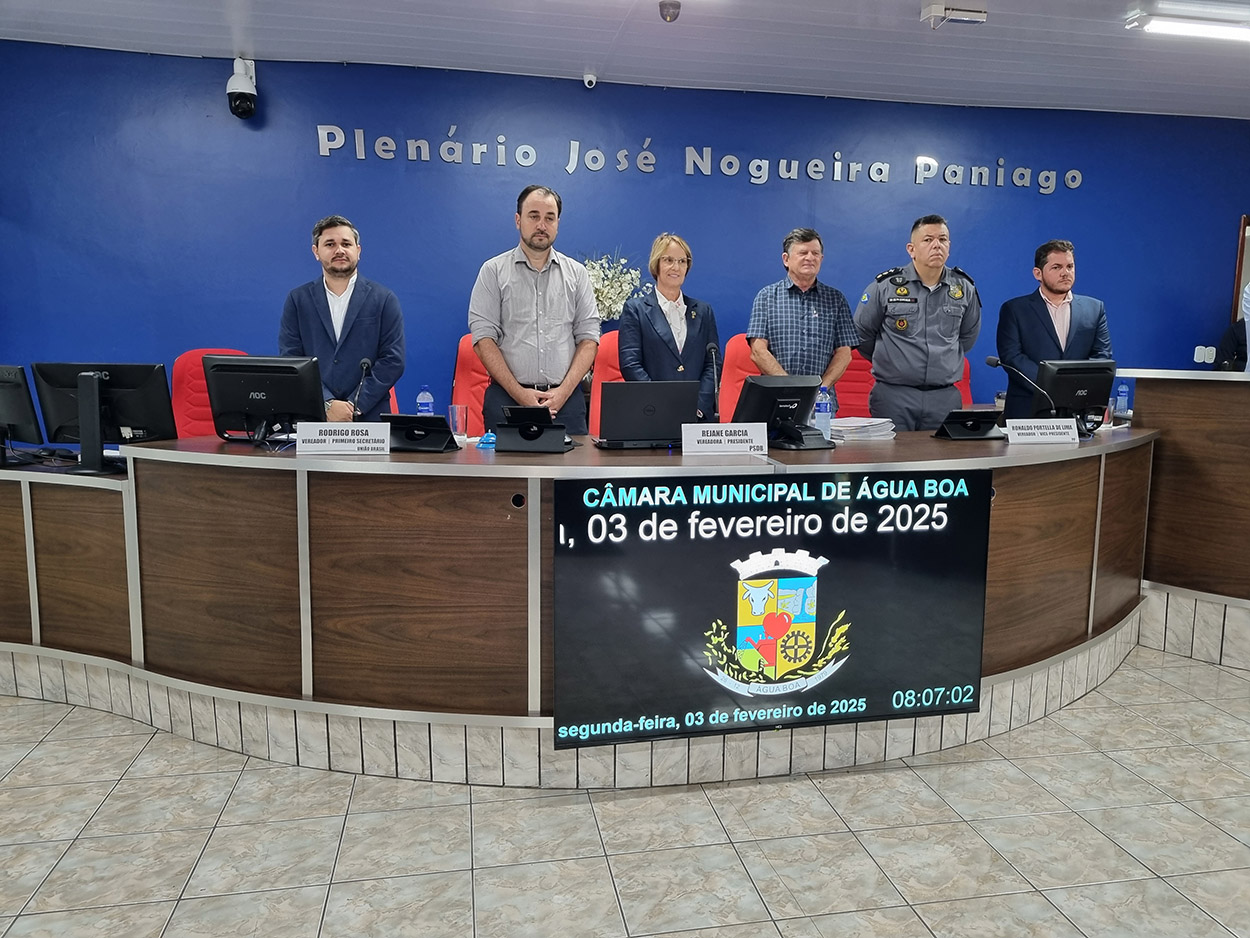 ÁGUA BOA - A Câmara Municipal deu início aos trabalhos da 11ª Legislatura na última segunda-feira, 3 de fevereiro de 2025, com a realização da primeira sessão ordinária. Os 11 vereadores da nova legislatura estiveram presentes e apresentaram diversas proposições, além de terem apreciado projetos importantes do Executivo Municipal.