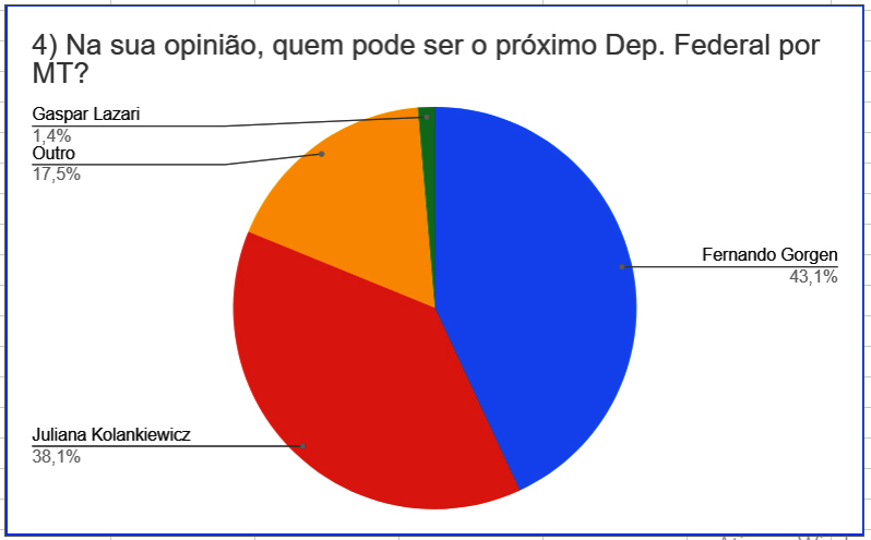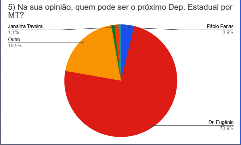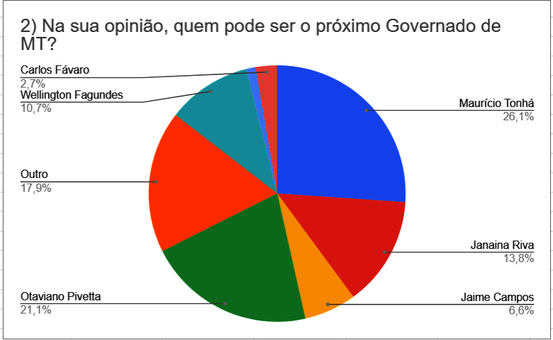 O senador Wellington Fagundes obteve 10,7%. Jaime Campos alcançou 6,6%. Carlos Fávaro chegou somente a 2,7%. Ao menos 17,9% dos internautas preferem outros nomes.