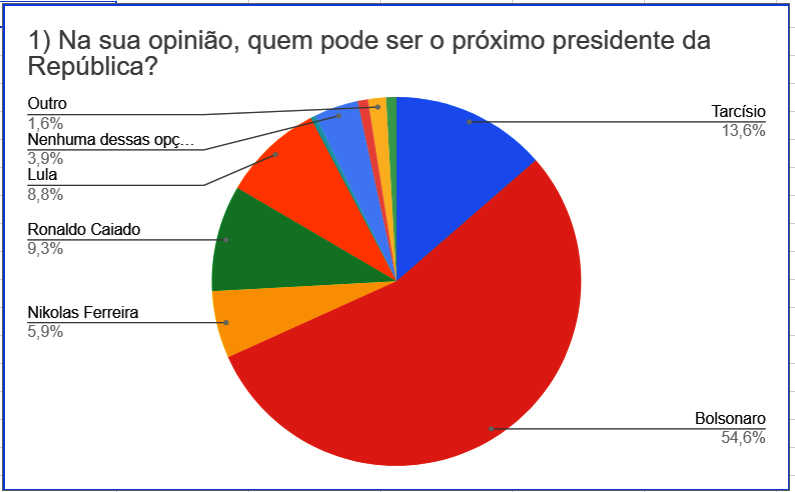 Na enquete disponibilizada em nosso site, para presidente da república, Bolsonaro, mesmo inelegível, recebeu 54% da preferência.