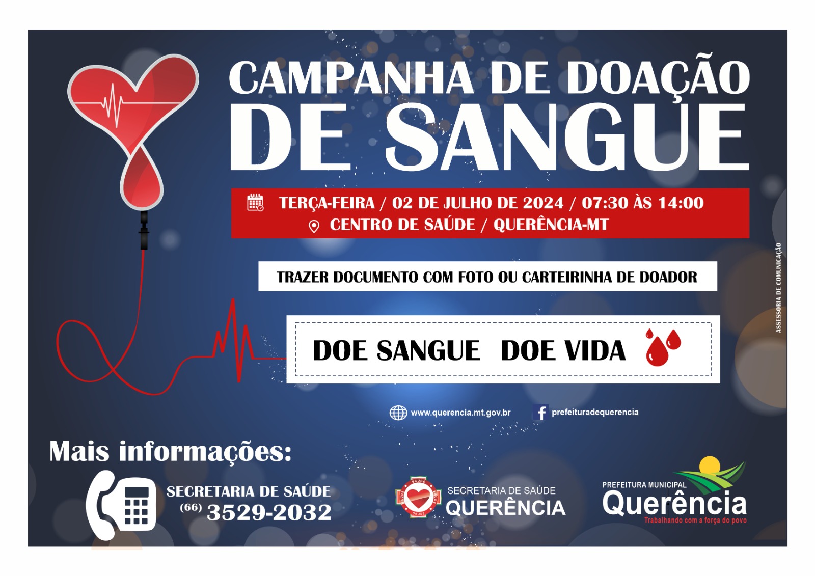 QUERÊNCIA - A Secretaria Municipal de Saúde informa a toda população que no dia 02/07/24 (Terça-Feira), haverá uma Campanha de Doação de Sangue. O ponto de coleta será no Centro de Saúde, das 7:30 até às 14:00 (Sem intervalo de almoço)
