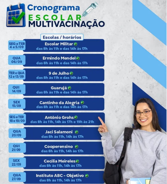 Dias 06 e 9 de setembro na Esc. Ermindo Mendel das 8h às 11h e das 14h às 17h.