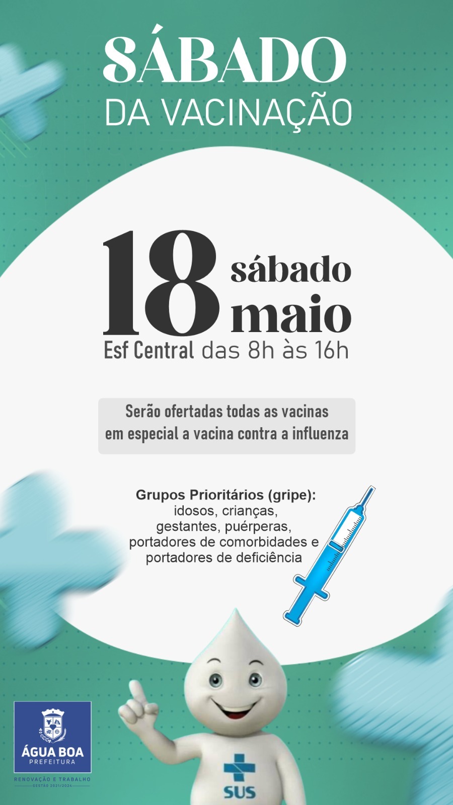 Atualizada dia 13 mai 24 ÁGUA BOA - No sábado, 18 de maio, acontecerá vacinação no PSF Central.