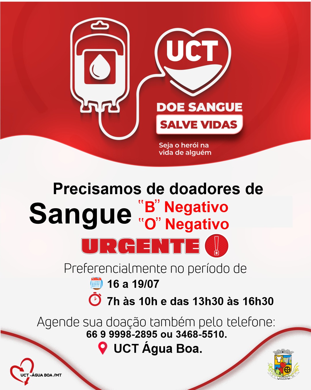 ÁGUA BOA - A UCT - Unidade de Coleta e Transfusão necessita de doadores de sangue tipos B negativo e O Negativo.