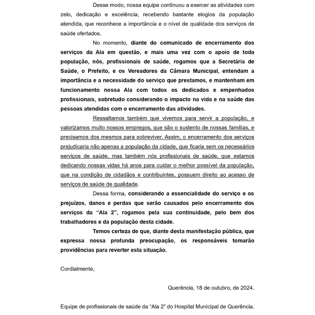 QUERÊNCIA - O fechamento da "Ala 2" do Hospital Municipal de Querência, previsto para o dia 12 de novembro de 2024, gerou uma polêmica, após uma carta aberta estar sendo divulgada em grupos de WhatsApp na cidade. A equipe de profissionais de saúde que atua no setor e a população local expressaram preocupação e insatisfação com a decisão. A Secretária de Saúde, Lubiane Boer, esclareceu que o principal motivo do encerramento é o término do contrato com a empresa responsável pela gestão da ala, além do fim da atual gestão municipal, o que inviabiliza a continuidade dos serviços.
