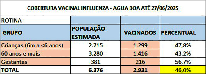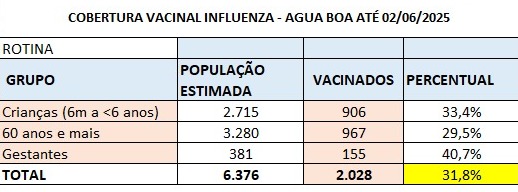 Atualizada dia 04 jun 25 ÁGUA BOA - Segue a campanha de vacinação contra a gripe influenza no município.