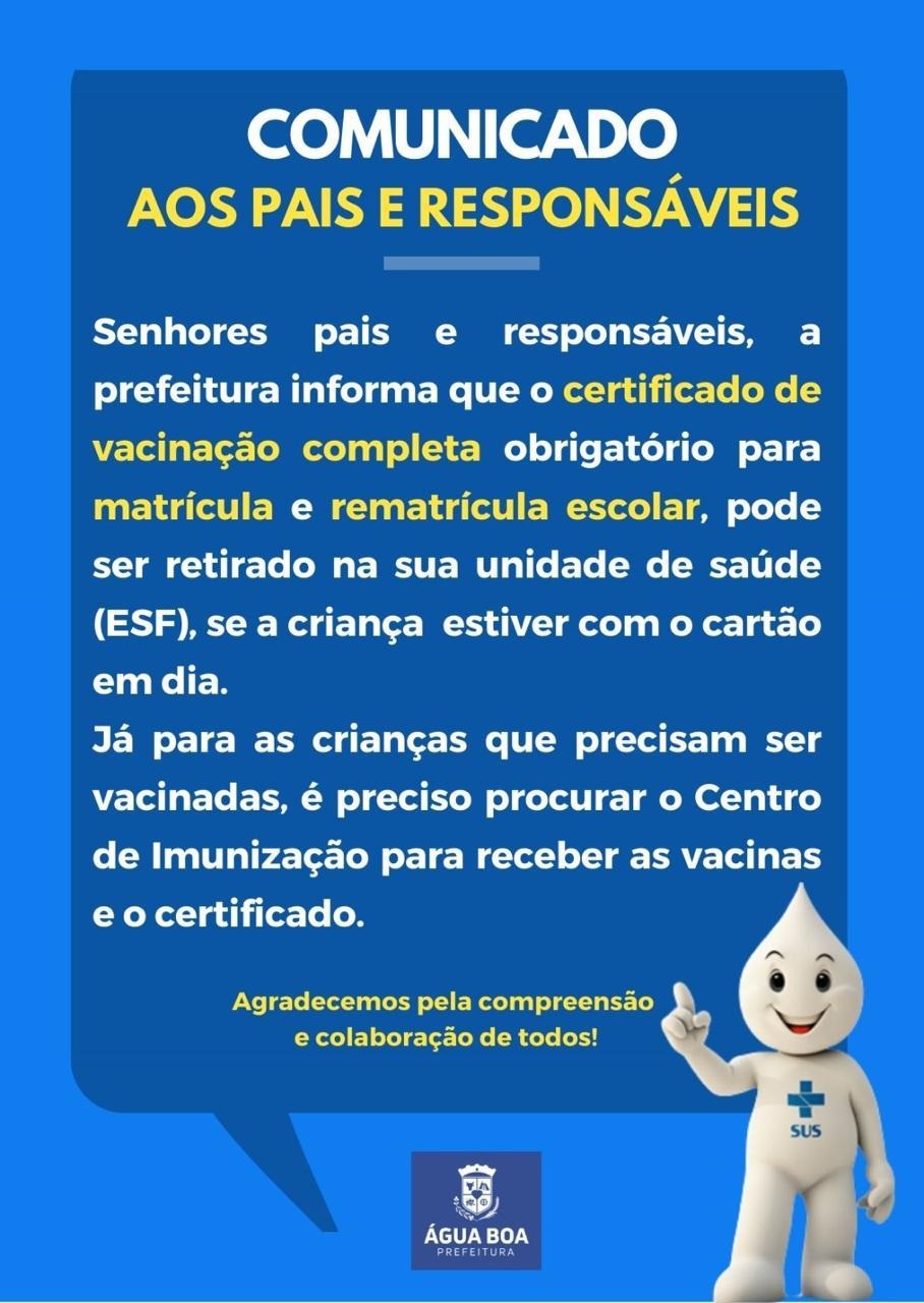 ÁGUA BOA - A Prefeitura de Água Boa divulgou um comunicado aos pais e responsáveis informando que o certificado de vacinação completa será obrigatório para a matrícula e rematrícula escolar das crianças da rede municipal de ensino.